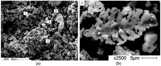 Samples with and without the addition of Co (0.5; 1; 1.5; 2 at. %), were obtained by diffusion sintering. To create porous alloys, we used TiNi powder of PN55T45S grade and cobalt powder of PK-IU grade. Micrographs of a mixture of powders TiNi-Co for sintering were shown in Figure 1, where the range of particle sizes of TiNi and cobalt powders was (100–140) μm and (70–100) μm, respectively. Co was used in the form of a crystalline powder intended for the production of the artifacts by powder metallurgy. It is important to note that TiNi powder is made of spongy particles (1), whereas cobalt powder particles are dendrite-shaped (2).