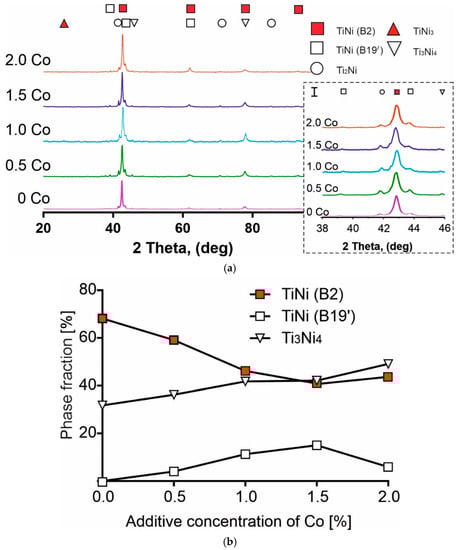 Alloys based on titanium nickelide (TiNi) have an optimal set of structural and functional properties, which allows them to be used for solving complex problems in medicine and technology [1,2,3,4,5,6]. Changing the Ni/Ti ratio and adding a third element as an alloying additive creates more opportunities for adjusting the structural characteristics of martensitic transformations, shape memory parameters and the mechanical properties of TiNi. Cobalt is an efficient means for the adjustment of these properties. Estimations of the effect of cobalt on the shape memory parameters and mechanical properties of monolithic materials, based on TiNi for medical purposes, were published in the literature [7,8,9,10]. Phukaoluan et al. showed that the addition of 3% Co in a TiNi alloy can increase the loading–unloading force of TiNi wire due to the increase in phase fraction austenite. These findings are consistent with Kok et al., who found that the martensite phase can have a cobalt ratio of up to 3 at.% in the TiNi alloy.