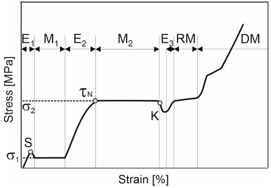 Figure 3 is a schematic representation built on the basis of repeated stages corresponding to the experimental dependences σ (ε) in Figure 4. Each stage has a different deformation mechanism: