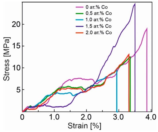 It was shown that an increase in the number of regions, with the fracture of the martensite phase at 1.5 at. % Co, correlated with the extension of the deformation plateau, regarding the dependency σ(ε) of the given sample in the process of the merger of yield areas, σ1 and σ2 (see Figure 4). At the yield stage, martensite is formed. The process is initiated by deformation, i.e., strain-induced martensite is formed, which leads to the extension of this stage [57].