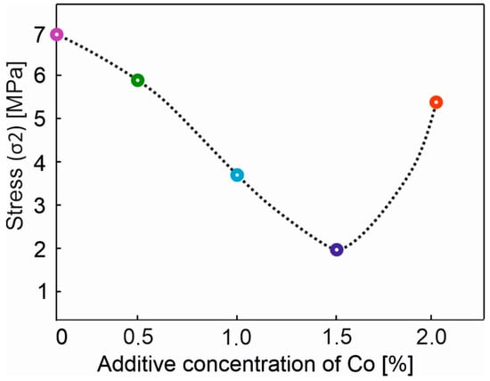 - With the addition of 0.5 at. % Co, a sharp decrease in stress is observed, and this trend persists up to 1.5 at. % of the dopant. With an addition of 2 at. % Co, the stress rises to the level established for the samples with dopant concentration of 0.5 at. %.