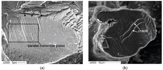 It should be noted that, in porous samples with additive concentrations ranging between 1.5 and 2 at. % Co, almost the entire fractogram area is occupied by groups of parallel plates with a clear orientation that is limited by the grain. In this case, a fracture has either an intragranular nature or signs of intergranular spalling (Figure 9a). The formation of an intragranular spall is caused by the development of a crack along the intragranular (transcrystalline) plane, and this plane is normally represented by a specific crystallographic plane (Figure 9b). The extensive formation of martensite is facilitated by an array of finely dispersed strengthening Ti3Ni4 phases that create stresses in the austenite structure. According to the Clapeyron–Clausius equation, these stresses, caused by the deposition of finely dispersed coherent Ti3Ni4 particles, lead to the formation of B19′ martensite crystals [1,56].
