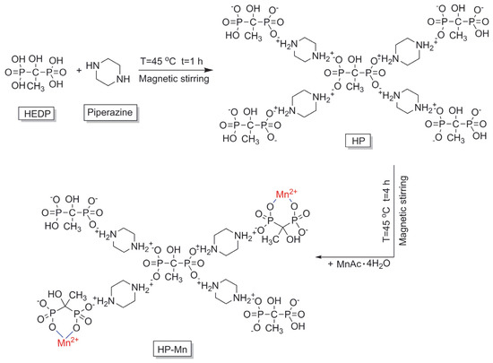 Mn2+-doped piperazine phosphate, named as (HP-Mn), was prepared in two steps according to the synthetic route as shown in Figure 1. The first step was to prepare the piperazine phosphate salt through an ionic reaction. To a 250 mL three-necked flask (China National Medicines Co., Ltd. Shanghai, China) equipped with magnetic stirring and a reflux condenser, piperazine (8.64 g, 0.1 mol) and 100 mL deionized water were added and stirred at 45 °C until the piperazine was dissolved completely. Subsequently, HEDP (20.6 g, 0.1 mol) was added to the above solution. Afterwards, the mixture was refluxed at 45 °C for 1 h. Finally, the reaction solution was cooled to room temperature, and solid powder was obtained after vacuum filtration. The product was washed with anhydrous ethanol several times, then vacuum-dried to constant weight at 100 °C and called HP (product yield: 91.3%).