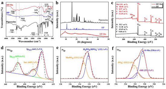 Figure 2 presents the FTIR spectra, XRD patterns and XPS diffractions of HP and HP-Mn. As can be seen in Figure 2a, the characteristic absorption peaks of piperazine at 3208 and 1553 cm−1 correspond to the stretching and bending vibration of the -NH- groups, respectively, and the one at 1328 cm−1 is ascribed to the stretching vibration of the C-N bond [30]. With respect to the FTIR spectrum of HP, the characteristic absorption peaks of HEDP are observed at 3268 cm−1 (-OH, stretching vibration), 3010 (-CH3, stretching vibration), 1135 (-P=O, stretching vibration), 1031 (P-O, stretching vibration), and 526 cm−1 (P-O, bending vibration) [31,32]. Notably, the disappearance of -NH- and the formation of a new peak of -NH3+ at 1451 cm−1 indicate that piperazine reacted with HEDP completely. After doping the Mn2+, most of characteristic absorption peaks of HP are also observed in the FTIR spectra of HP-Mn. However, it should be pointed out that the stretching (1031 cm−1) and bending (526 cm−1) vibration absorption peaks of P-O are blue shifted to 1060 and 550 cm−1, respectively, indicating that HP interacts with Mn2+ through the P-O- group in HEDP [27,33].