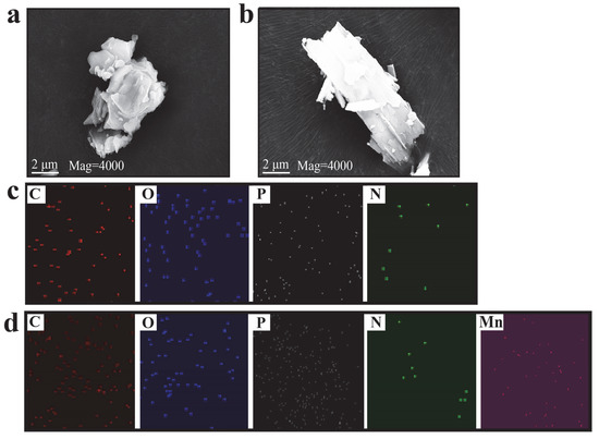 The SEM images with EDS mapping of HP and HP-Mn are illustrated in Figure 3. In contrast to the irregular shape of HP (Figure 3a), the HP-Mn presents a flake structure (Figure 3b). Such changes in the morphology may result from the strong chelation between Mn2+ and the phosphoric group, which was replaced partially by the hydrogen bond between piperazine and HEDP. As can be seen in the EDS mapping (Figure 3c,d), the nitrogen phosphorus and manganese elements are distributed on HP or HP-Mn uniformly, suggesting that HP and HP-Mn have been successfully prepared.