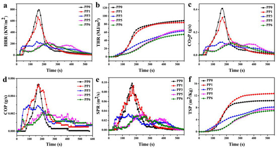The cone calorimetry test (CCT) was used to investigate the combustion behaviors of the pure PP and its flame-retardant composites, and five typical samples of PP0, PP1, PP3, PP5, and PP6 were selected. Some representative results are shown in Figure 4 and Table 3.