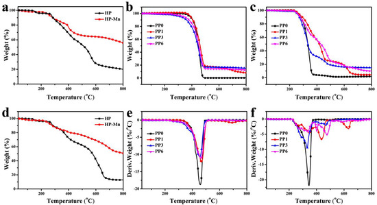 As can be seen in Figure 5a, both HP and HP-Mn present good thermal stability under nitrogen atmosphere and the initial decomposition temperatures (T5 wt.%, defined as the temperature at which 5.0 wt.% mass loss occurred) are 267.2 °C and 247.0 °C, respectively, which meet the processing temperature of PP. Additionally, although the HP-Mn decomposes early than HP, its residual yield (55.8%) is far greater than the later (20.0%). This indicates that the HP-Mn possesses excellent char-forming ability than HP. This may contribute to the fact that Mn2+ can catalyze the earlier thermal decomposition of HP and promote it to form char with high quality, which acts as a physical barrier to protect the further degradation of the inward matrix. Similar thermal degradation behavior is observed for HP and HP-Mn under air atmosphere (Figure 5d).