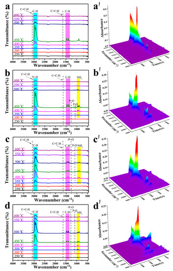 FTIR spectra and 3D TG-FTIR of the pyrolysis products of PP0 (a,a′), PP1(b,b′), PP3 (c,c′) and PP6 (d,d′) at different temperatures.