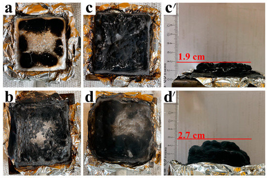 Digital photographs of the char residue of PP0 (a), PP1 (b), PP3 (c,c′), and PP6 (d,d′) after CCT.