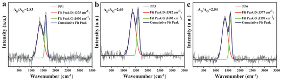The quality of char residues after CCT was further characterized via Raman spectroscopy, as depicted in Figure 9. Two sharp peaks at 1377 cm−1 and 1600 cm−1 are attributed to the D and G bands, representing the graphitic structure and lattice defect of carbon atom, respectively. Generally, the area ratio (AD/AG) of D and G bands reveals the graphitization degree of the char residue, and a lower AD/AG value means a higher graphitization degree and better quality of the char layer [49]. The calculated AD/AG values are in descending order of PP1 (2.83) > PP3 (2.69) > PP6 (2.54), which indicates that the combination of APP and HP-Mn can improve synergistically the quality of char residue as compared with the incorporation of APP or HP-Mn alone, which facilitates the formation of much denser and continuous char layers with high strength. The flame retardancy, consequently, is improved with the combined incorporation of APP and HP-Mn.