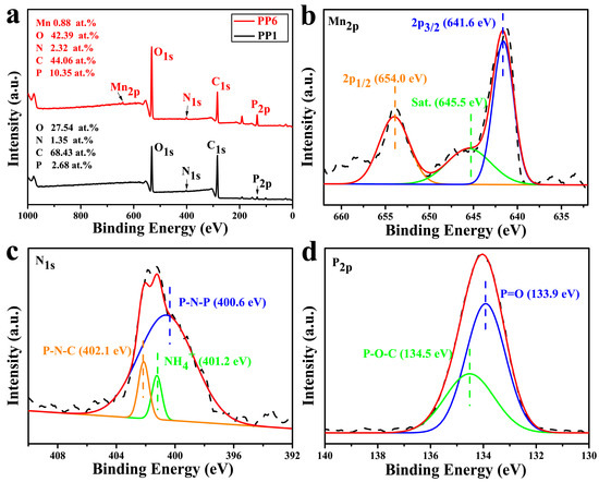 Furthermore, the elemental compositions of the char residue of PP1 and PP6 were measured by XPS analysis, and the corresponding spectra with Mn 2p, N 1s, and P 2p high-resolution are shown in Figure 10. Obviously, four common elements, including O, N, C, and P, are found in the residue of both PP1 and PP6 (Figure 10a). In comparison with PP1, a new peak at 641.4 eV (Mn 2p) appears in the spectra of char residue of PP6. Moreover, there are higher O and P contents in the char residues of PP6 sample as compared with PP3. It might be due to that the catalytic cross-linking ability of Mn2+ promotes the formation of more phosphorus-oxygen bonds in the char residue during combustion. For Mn 2p spectrum (Figure 10b), the peaks at 641.6 eV, 645.5 eV, and 654.0 eV are assigned to Mn 2p3/2, the satellite peaks of Mn 2p3/2 and Mn 2p1/2, respectively. In N 1s spectrum (Figure 10c), the peaks at 400.6 eV, 401.2 eV, and 402.1 eV are attributed to P-N-P, NH4+, and P-C-N, respectively [50]. For P 2p spectrum (Figure 10d), the peaks at 133.9 eV and 134.5 eV correspond to P=O and P-O-C groups in polyphosphoric acid and pyrophosphoric acid [51], respectively. All XPS results show that the Mn2+ plays an indispensable role in the generation of high-quality carbon layers and the APP/HP-MN system can promote the formation of cross-linking structures during combustion, which facilitates the formation of a high-quality char layer.