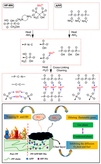 Based on the above analysis of the gaseous pyrolysis products and the char residues after CCT, the flame retardant mechanism of PP/APP/HP-Mn composites is illustrated in Figure 11. In the gas phase, the decomposition of HP-Mn and APP produces not only non-combustible gases (NH3), but PO• radicals and Mn2+ which can trap the free radicals produced by PP during the combustion. In the condensed phase, P-N-C groups that acted as carbon source reacted with other products decomposed by HP-Mn in the initial stage of the combustion and formed a high-quality char layer at a higher temperature under the catalysis of APP. A high-quality char layer could act as a barrier to prevent further decomposition of the PP composites. It is worth noting that Mn2+ can not only bridge adjacent -PO−, but also HP-Mn and APP, and then form a compact and strong char layer in a short time.