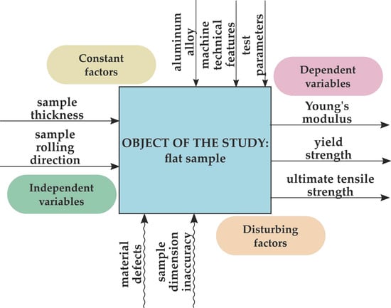 The independent variables included the thickness and the direction of rolling of the samples. The analyzed dependent factors were Young’s modulus E, yield strength Rp0.2, and ultimate tensile strength UTS Rm. The constant factors affecting the object were EN AW-2024 T351 aluminum alloy, technical features of the machine, and test parameters, while the disturbances included dimensional inaccuracy of samples and material defects.