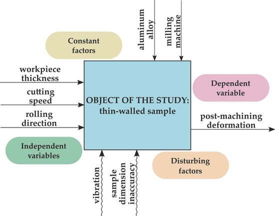 The independent variables were cutting speed (corresponding to conventional and high-speed cutting), sample thickness, and rolling direction, while the dependent variable was post-machining deformation. Milling machine and aluminum alloy were defined as constant factors. The disturbing factors included vibrations and dimensional inaccuracy of the samples. In order to determine the significance of the influence of the studied independent variables on the dependent variable, a complete, randomized, statistical program was also used [].