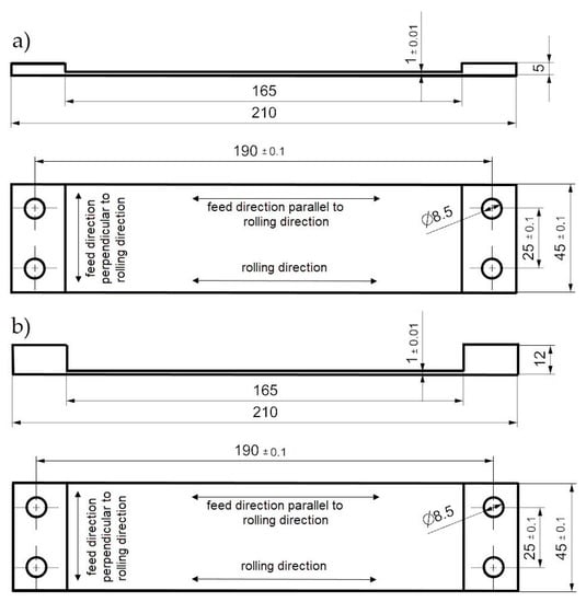 In the tests, the semi-finished products were the rolled plates with thicknesses of 5 mm and 12 mm made of the EN AW-2024 T351 alloy. A WaterJet Combo machine tool by ECKERT (Eckert AS Sp. Z o.o., Legnica, Poland) was used to cut the cuboidal samples. Figure 3 shows the view of the samples after machining. In both cases, the relief had a length of 165 mm and a width of 45 mm, as well as the thickness of the bottom of 1 mm. The relationships between the cutting tool feed direction and the rolling direction were also determined.