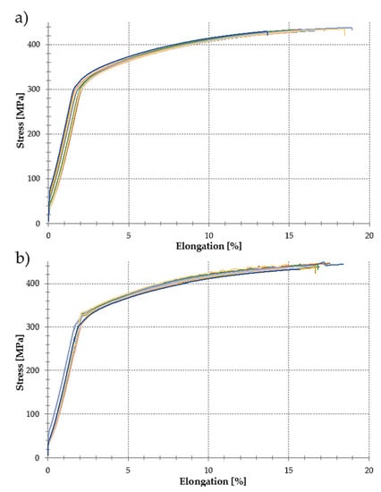 The mechanical properties of the EN AW-2024 T351 aluminum alloy were determined on the basis of the results obtained in the static tensile test. Figure 4 shows an example of the stress-elongation characteristics for samples with a thickness of 1 mm, for which the tension direction was, accordingly, perpendicular (Figure 4a) and parallel (Figure 4b) to the rolling direction.