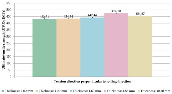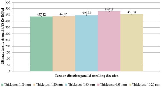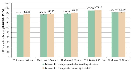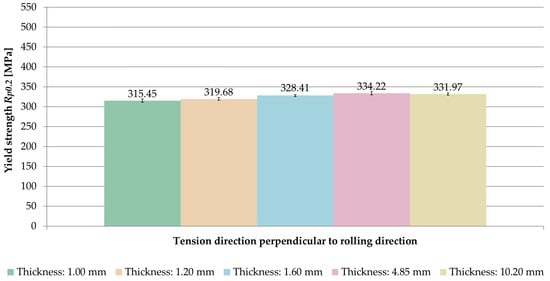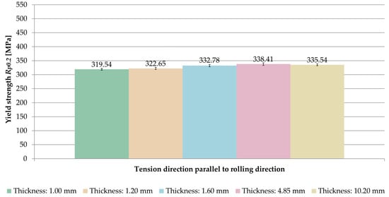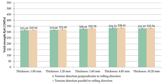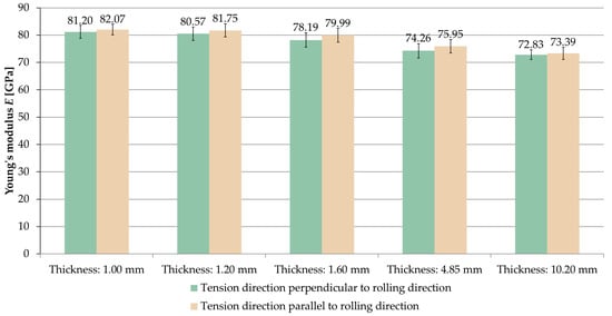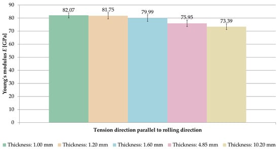 Figure 5 shows the average values of Young’s modulus E received for the analyzed sample thicknesses and the relationships between the tension direction and the rolling direction. On the basis of the results, it was found that for all thicknesses, the value of the longitudinal modulus of elasticity E was greater in the range of 0.7–2.3% for the tension parallel to the rolling direction than for tension in the perpendicular direction.