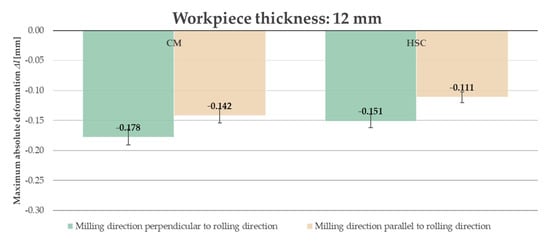Comparison of the maximum absolute deformations Δl depending on the ratio of the milling direction to the rolling direction for the semi-finished product with a thickness of 12 mm.