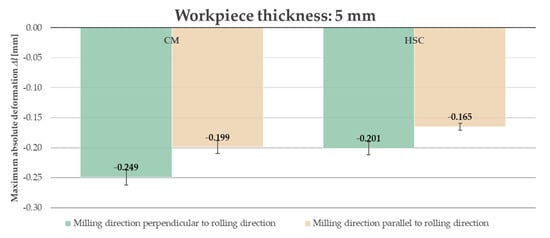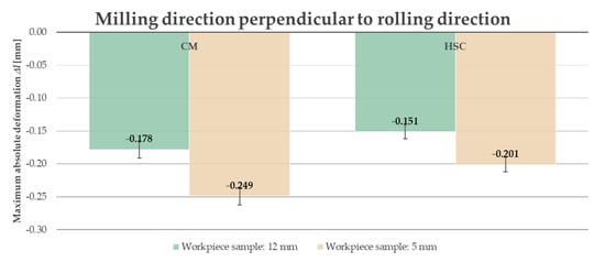 Due to the fact that, in industrial practice, thin-walled elements undergo significant deformation at the moment when the clamping forces are removed, it was decided to present the results after unfastening the workpiece from the clamping device. Furthermore, analyzing the obtained results, i.e., the course of the absolute deformation Δl as a function of the sample length l, it was observed that its maximum value occurred in the center of the sample (around l = 82.5 mm) in all cases. A characteristic “negative” deflection was noted, denoting the location of the deviation below the adopted “zero” line, meaning lack of deformation. Hence, the results of the deformation tests were developed and presented in the form of bar graphs referring to the recorded maximum values. The abbreviation “CM” determines conventional machining and HSC denotes High-Speed Cutting. Figure 14 and Figure 15 present a comparison of the maximum absolute deformations Δl depending on the ratio of the milling direction to the rolling direction for the tested semi-finished product thicknesses, while Figure 16 and Figure 17 show the maximum absolute deformations Δl as a function of the semi-finished product thickness for milling in the perpendicular and parallel directions to the rolling direction, respectively.