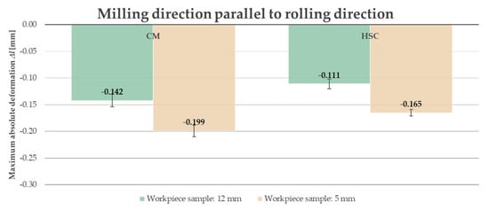 Comparison of the maximum absolute deformations Δl depending on the semi-finished product thickness for milling in parallel direction to rolling direction.