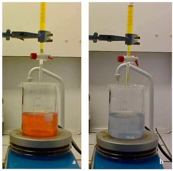 Three different batches of each product were analyzed and distributed in the following groups: group 1—6% HP; group 2—16% carbamide peroxide (CP); group 3—10% CP; and group 4—5% CP (White Dental Beauty®, West Yorkshire, UK) (Table 1). Titrations were performed with Cerium Sulphate IV (CS) to determine the HP concentration [,]. The samples were weighed in a 600 mL beaker on an analytical balance with ± 0.1 mg sensitivity (Metler Toledo AB54, Toledo, Spain). Each sample was diluted in 225 mL of deionized water; 25 mL of a solution of 5.0 M sulfuric acid (H2SO4) were added while stirring over a stir plate (200–300 rpm); and 10 drops of ferroin indicator solution were added (Fluka, Switzerland), giving the solution a dark orange color. The samples were titrated with a 0.1 M Cerium Sulfate IV solution (CeSO4·4H2O, # 31606, Sigma-Aldrich, Darmstadt, Germany). At the equivalence point, the sample changed from dark orange to pale blue (Figure 1). The relationship between the volume of CS used in the titration of the sample and the sample weight (SW) was expressed in a formula and used to determine the percentage of HP (% by weight) that was recovered in each sample (formula (1)):
