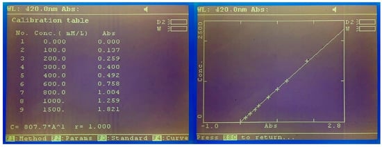 The release kinetics of HP was evaluated by a spectrophotometric technique previously established, which uses 2,2’-Azino-bis (3-ethylbenzothiazoline-6-sulfonic acid) diammonium salt (ABTS) as a chromogen [,]. In each test, approximately 300 mg of gel were weighed and scattered on the bottom of a petri dish (VWR, Sarstedt, Germany), previously weighed. Immediately, 15 mL of distilled water were added to the peripheral area of the petri dish and placed on an orbital shaker (Kottermann 3047, Uetze, Germany) at a speed of 50 rpm. At predetermined times (0, 1, 2, 3, 4, 5, 10, 15, 20, 30, 40, 60, 90, 120, 150, 180, and 240 min) that accorded with the application times indicated by the manufacturers of each of the products, a 100 μL sample was collected and replaced in deionized water using a micropipette (P100 Eppendorf, Sigma-Aldrich, Darmstadt, Germany). The samples were analyzed in a spectrophotometer (M501 single beam, CAMSPEC, Leeds, United Kingdom) at 420 nm wavelength to determine HP content by a peroxidase-based colorimetric method. A phosphate-based buffer solution was made from two buffer solutions (87.9% by volume of 0.05 M KH2PO4 and 12.1% by volume of 0.05 M Na2HPO4), with a pH = 6.0. From this solution, a solution of ABTS 2.08 M and a solution of horseradish peroxidase 400 U /mL were elaborated. The final volume present in the microcuvette (MonoLab, Carpi, Italy) was 1.5 mL (1.44 mL ABTS buffer solution + 30 μL peroxidase buffer solution + 30 μL sample). For the calibration of the spectrophotometer (M501 single beam, CAMSPEC, Leeds, United Kingdom), the calibration curves were drawn up on the same day, with 10 calibration points, being accepted as valid with a confidence coefficient equal to or greater than 99% (Figure 2). The calibration points shown represent the following concentrations: 0, 50, 100, 200, 300, 400, 600, 800, 1000, and 1500 μM PH. Ten samples of each batch were analyzed (n = 30 per group) in the predetermined time periods.