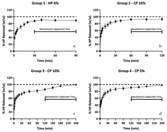 When considering the obtained results, it was possible to observe that almost all HP content was released during the manufacturers’ recommended time intervals, although total HP release was never attained.