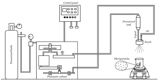 The atomization apparatus was already described elsewhere (Herrero et al.) and is illustrated in Figure 1 []. Experiments begin with the introduction of alginate solutions into the pressurized tank (with maximum capacity 50 mL).