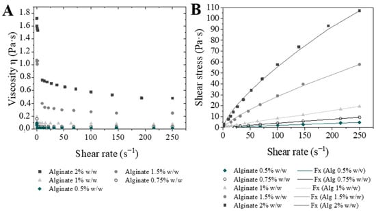 The highest difference was found for the viscosity of the solutions, ranging from 15 to 450 cP. These values were calculated as the slope of the curve shear stress–shear rate (Figure 2A) that, at the same time, was determined with steady shear experiments. Moreover, Figure 2A,B illustrate the pseudoplastic nature of the alginate. This behavior indicates that at the beginning (without shear rate) the polymeric chains are intertwined and the flow resistance is higher. However, increasing the shear rate promotes a polymer chains alignment, and as a consequence the viscosity is reduced. This phenomenon has been already reported for many polymeric solutions [,].