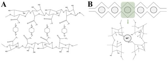 (A) Schematic representation of interactions between alginate and piperazine to form microparticles; (B) schematic representation of the interactions between alginate and divalent ions.