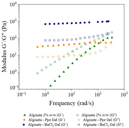 On the other hand, the rheological behavior of (1) alginate-piperazine (Alg-Ppz) and (2) alginate-barium chloride (Alg-BaCl2) hydrogels was studied, always at 25 °C, with an oscillatory analysis, performing a frequency sweep from 0.5 to 500 rad·s−1 at a fixed strain that must lie in the linear viscoelastic region. This strain was selected after performing previously a strain sweep analysis (from 0.5% to 300% strain) at a constant angular frequency of 1.0 rad·s−1 and at 25 °C. According to the strain sweep results, we fixed a 1% strain for the subsequent oscillatory analysis.