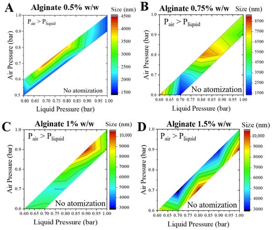 Alg-Ppz MPs. Air and liquid pressures influence on particle size diameter for different alginate concentrations; (A) 0.5% w/w; (B) 0.75% w/w; (C) 1.0% w/w; (D) 1.5% w/w.