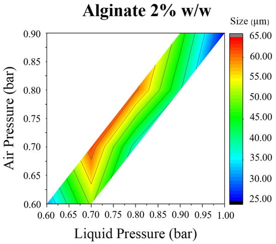 For the system with piperazine as a crosslinker, it is possible to observe the effect of the alginate concentration on the particle size (Figure 5). From 0.5% w/w to 1.0% w/w, the bigger microparticles were produced at intermediate values of air and liquid pressure. However, solutions of alginate with a concentration of 1.5% w/w formed an agglomeration of particles with an elongated shape in the liquid surface due to the high viscosity, and the pressure map was clearly different.