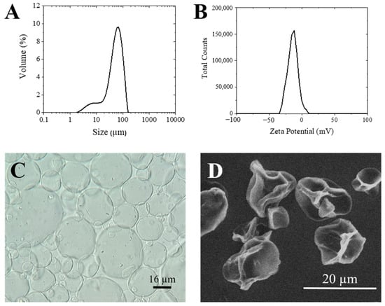 Characterization of Alg-Ppz MPs. (A) Size distribution by DLS; (B) zeta potential by DLS; (C) optical microscope image; (D) ESEM images.