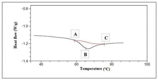 Gelatinization temperatures were also measured by differential scanning calorimetry (DSC). The DSC test was performed using the TA Instrument Q 200 differential scanning calorimeter (New Castle, DE, USA). Approximately 8.0 mg of rye flour was weighed into the aluminum pans. Water was added to obtain the ratio of flour:water as 1:1. The pans with the product were hermetically sealed and kept for 24 h at room temperature. After this time, the pan with the analyzed rye flour and an identical empty pan (used as a reference sample) were placed in a calorimeter and then were heated from 20 to 110 °C at the rate of 10 °C min−1. Figure 1 shows an example of the DSC graph. The onset (To, point A), peak (Tp, point B) and conclusion (Tc, point C) temperatures and the gelatinization enthalpy were estimated directly from the instrumental software. The gelatinization enthalpy was calculated per 1 g of flour. To corresponds to the amylograph pasting temperature. Tp corresponds to the temperature at which the conversion rate is the highest, i.e., the temperature at which the flour sample absorbs the most heat per unit of time. Tc corresponds to the amylograph peak temperature.