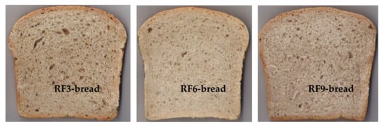 Figure 2 shows example images of bread crumbs. One of the most important quality parameters of bread is its volume. This parameter reflects the quality of flour and depends on the technological process used in breadmaking. Generally, at the same weight of bread, the higher loaf volume indicates higher quality because the bread dough had a greater capability of carbon dioxide production and retention during baking []. In our study, the bread volume (BV) was evaluated in the range 169–208 cm3 100 g−1 for flour items RF9 and RF3, respectively (Table 5). In the earlier studies of Stępniewska et al. [], variants of bread prepared from several samples of rye flour of high extract rate obtained by indirect methods using sourdough were characterized by BV in the range 171–249 cm3 100 g−1.