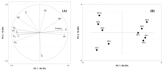 Based on correlations among variables tested and linear combinations of them, the PCA method builds so-called latent variables (principal components, PCs), which extract as much data variability as possible. The multi-axes space of the original variables is usually altered by 3D-space with rectangular coordinates PC1-PC3, which are independent of each other. A condition of successful data transformation is explaining at least 70% of the original data by these triple of PCs. Further, principal components PC4 and PC5 are commonly omitted owing to their small contribution to the data scatter explanation. Within the present study, the closeness of quality among flour items RF1–RF10, as well as the potential alternation among quality features observed, were explored. The results of PCA showed that the first two principal components (PC1, PC2) explained 74.55% of the variation of original quality parameters (Figure 3A). The PC1 accounted for 58.19% of the data scatter with the major parameters, such as analytical: starch (S), protein (Pro), pentosans (PC), amylograph peak viscosity (APV), DSC enthalpy and bread quality; parameters: bread volume (BV), crumb hardness one (H24) and three (H72) days after baking. The S, APV, BV and gelatinization enthalpy are located on the right side of the loading plot. Meanwhile, the rest of the parameters are located on the left side of the loading plot. The PC2 explained 16.36% of the variation and was strongly positively related to falling number (FN) and amylograph pasting temperature (IT), as well as negatively related only to increased bread crumb hardness (IH). The analytical: Pro, PC; DSC: Tp and To; and bread quality parameters: H24, H72 are closely located on the same side of the loading plot indicating that crumb of bread from rye flours, which are characterized by higher PC and Pro, have higher hardness. Whereas gelatinization enthalpy, S and BV are present closely on the opposite side of the loading plot. This indicates that flour, which is characterized by higher starch content, is also characterized by higher enthalpy.