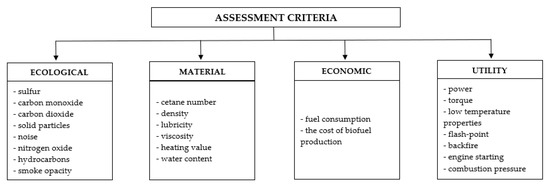 The aim of the tests was to compare power units powered with different mixtures of virgin diesel oil and fatty acid methyl esters. The assessment of the power units was performed on the basis of their significant characteristics [29]. The assessment covered the distinguished ecological parameters and those described earlier. It was a normalized comparative assessment which referred to the accepted point of reference. In the analyzed case, the values of the characteristics describing the analyzed parameters could be lower or higher than the values of characteristics that represented the point of reference.