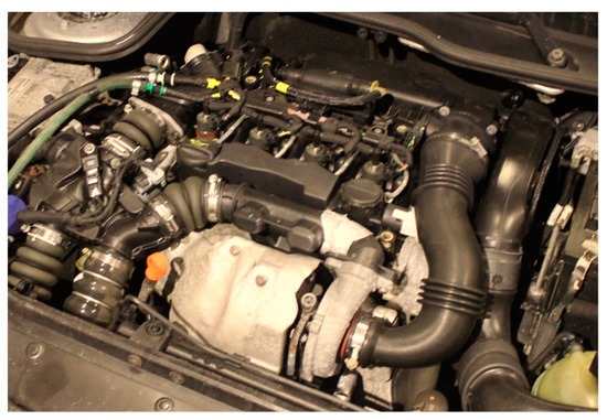 The tested objects were three self-ignition engines with identical technical parameters. The engines are widely used in car transport. They are mounted in passenger and delivery cars of different makes. The engines used for the tests were popular models that are found in vehicles. Three identical power units were used to provide reliable results. The tests covered engines with power output 81 kW, characterized by indirect fuel injection and a common rail fuel injection system. The tested engines were mounted in vehicles, thanks to which it was possible to simulate road conditions. An image of one of the analyzed engines, which was installed in a vehicle, is presented in Figure 2, whereas technical specifications of particular engines are presented in Table 2.