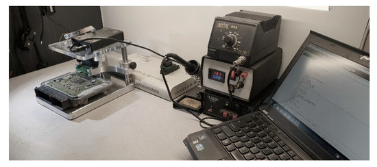 The engines were also modified by adjusting the electronic system through modification of computer software. The introduction of computer software changes was performed to find out whether and how the number of exhaust components and the number of solid particles emitted to the environment changed. Due to the specificity of the electronic system, the software changes required dismantling the deck computer and mounting it on the modification stand, as shown in Figure 3.