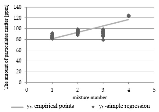 A linear multi-factor regression equation was developed to assess the dependence of the power unit performance parameter values Y for fuel mixtures, dependent on the fuel injection modification X. Six performance parameters (fuel components and solid particles) were tested for the four settings of combustion engine computer software and four fuel mixtures. The test results were averaged for the three analyzed power units. Since numerous calculations had to be performed, the study includes an exemplary regression equation for the ‘solid particles’ parameter based on the vehicle computer software settings. The graphic interpretation of the obtained results is shown in Figure 5 as follows: a chart shows the empirical points, while a graphical chart is depicted as a determinant of theoretical parameters.