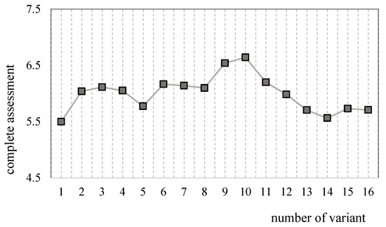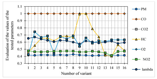 The results presented in the table present the ratings for individual operational parameters and sixteen variants of the mixture–controller setting. The graphic interpretation of these results is shown in Figure 6.