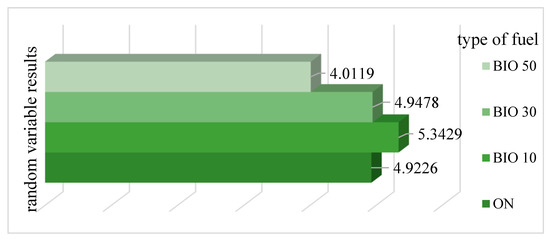 The values of the random variable Zx for particular fuel mixtures (ON, BIO10, BIO30 and BIO50) reflect the sum of the vector component products and assign them weights. The ON mixture (‘virgin’ diesel oil) was the point of reference. As can be seen in the chart, the random variable determined for the BIO10 mixture (90% of diesel oil and 10% of fatty acid methyl esters) and BIO30 mixture (70% of diesel oil and 30% of fatty acid methyl esters) is higher than that of the point of reference. The random variable of the BIO50 mixture is lower by approximately 18% than that of the point of reference. The obtained results indicate a beneficial effect of the BIO50 mixture.