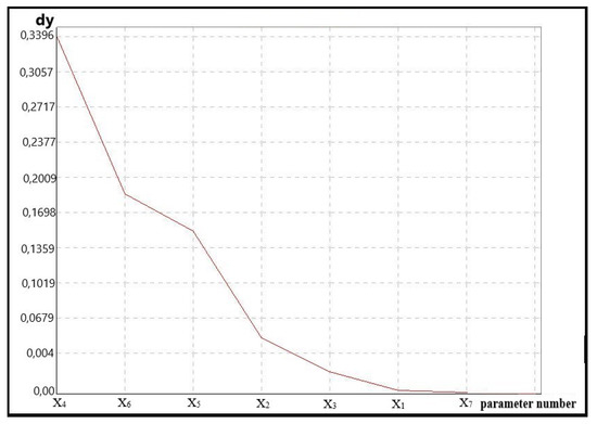 The test results make it possible to find out which of the analyzed parameters was sensitive to the changes and whether it can be omitted in further research. Exemplary charts of the most sensitive parameter X4 and little sensitive X7 are presented in Figure 13 and Figure 14.