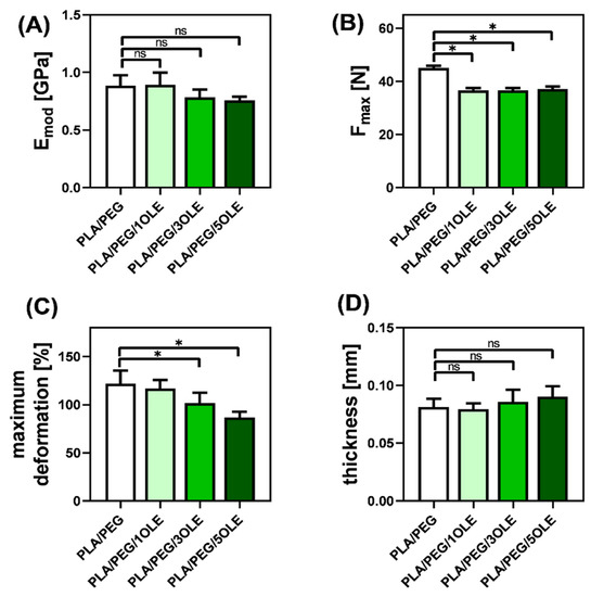 The mechanical properties: (A) Young modulus, (B) maximum force at break, (C) maximum deformation, and (D) thickness of the obtained films; *—statistically significant difference vs. control sample (PLA/PEG); ns—no statistically significant difference vs. control sample (PLA/PEG).