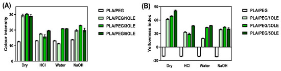 Color intensity (A) and Yellowness index (B) of PLA/PEG and PLA/PEG/OLE films.