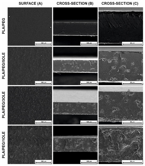 SEM images of PLA/PEG and PLA/PEG films with olive leaf extract addition: surface in 1000× magnification (A), and cross-section in 1000× (B) and 2500× (C) magnification.