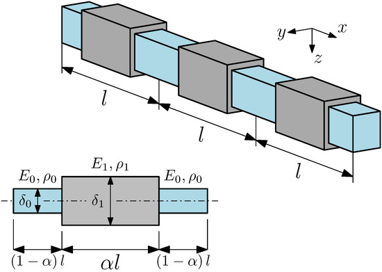 We consider an elastic beam of length L with l-periodic variation of geometric and material properties. These two types of properties variation are: variable height and variable material properties , . The first case is related to a piecewise change of beam cross-section (stepped beam) for a beam made of a homogeneous material. Then, for steel the Young modulus , the mass density , the Poisson’s ratio are assumed. The cross section is rectangular: , .