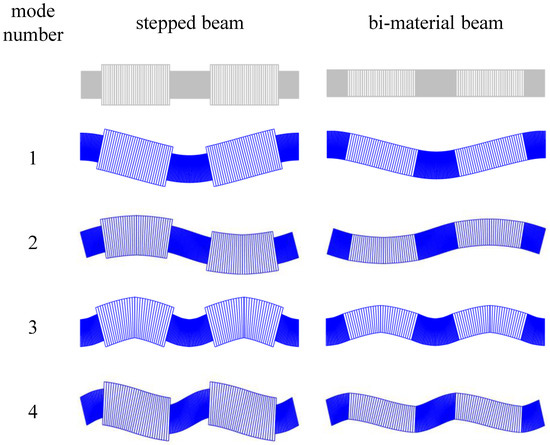 The first four eigenmodes for stepped and bi-material beams for .