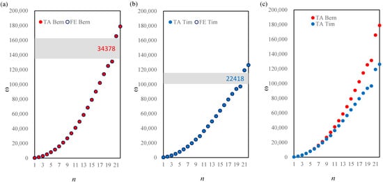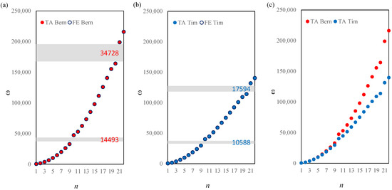 Comparison of the natural frequencies between the TA and FE models according to the Bernoulli (a) and Timoshenko (b) theories, and comparison between the two models (c), for a stepped beam.